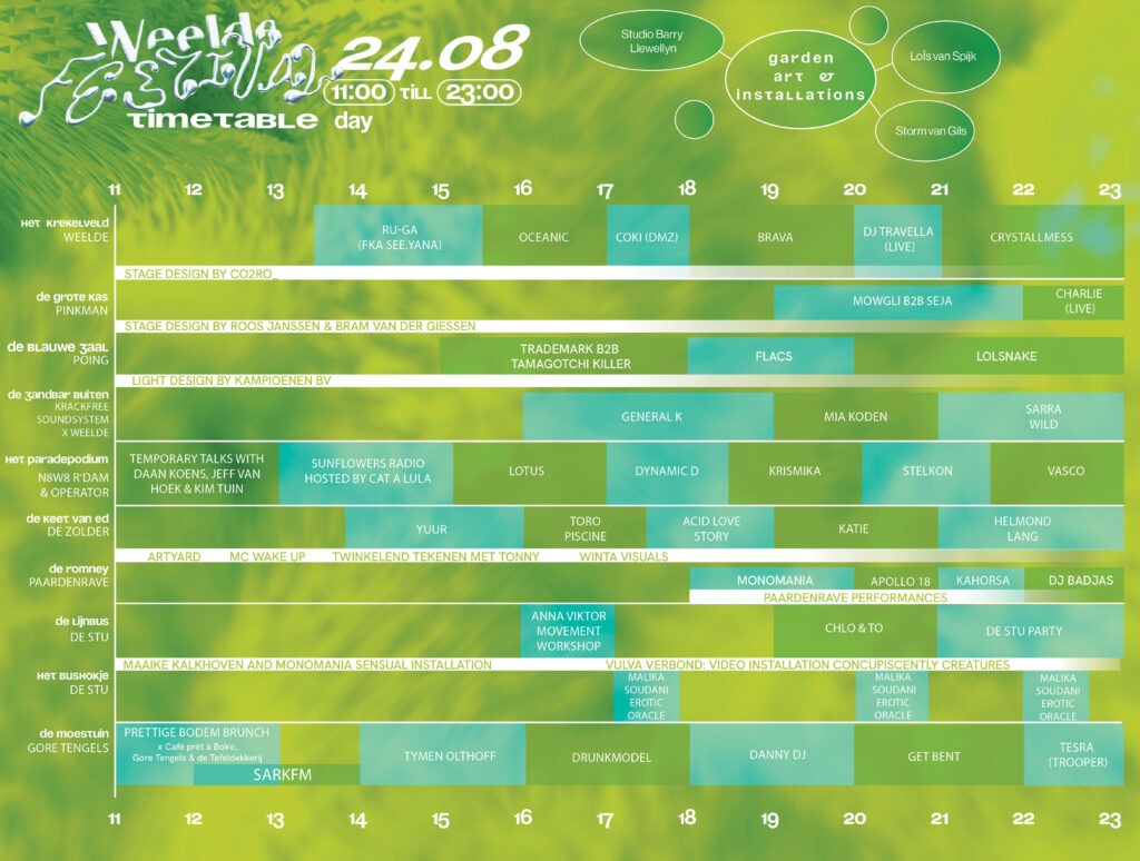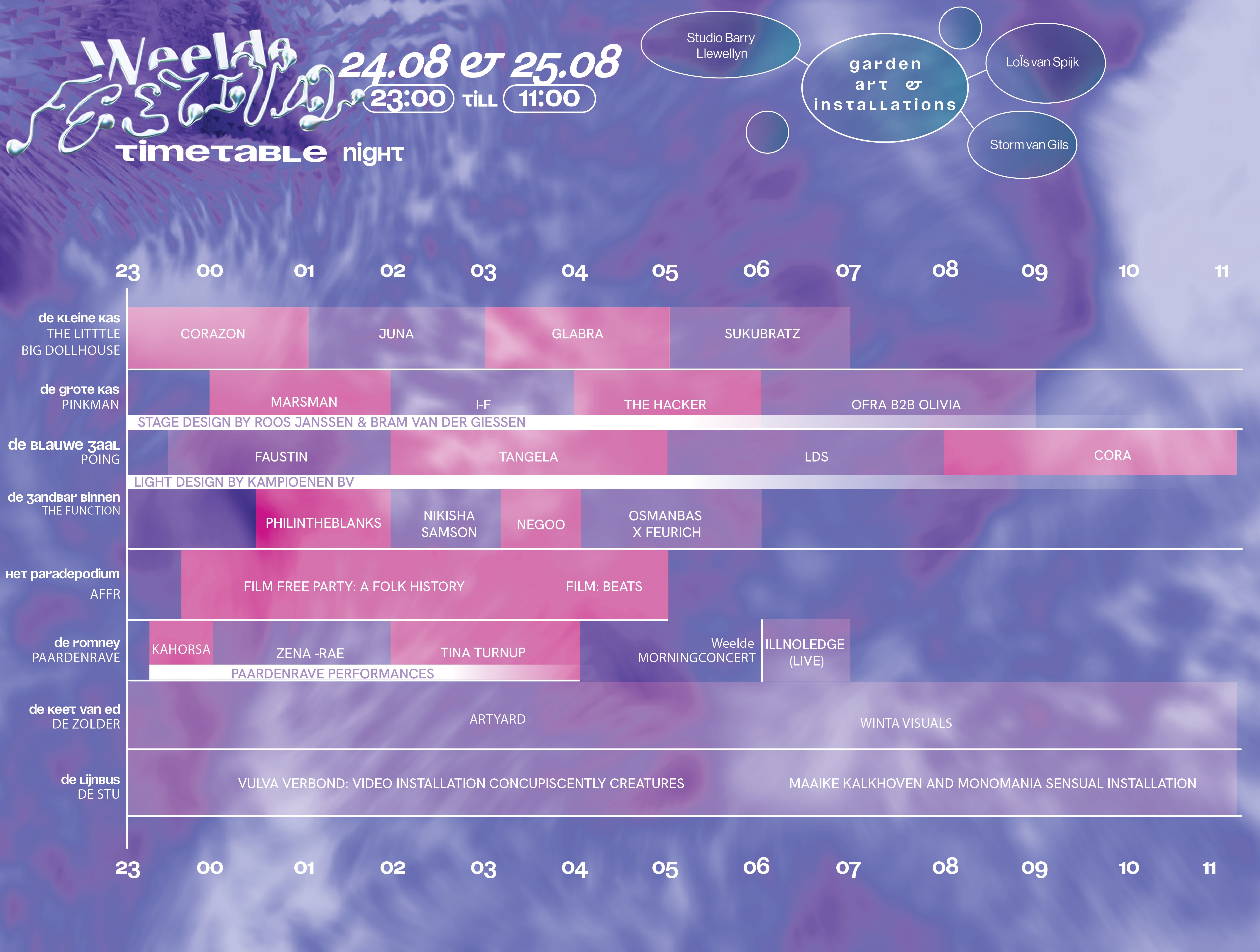 Pinkman, POING Club, Krackfree Soundsystem X Weelde, Operator, Paardenrave, De Stu, The Litttle Big Dollhouse, The function, De Zolder, N8W8, AFFR, Gore Tengels, De Zure Bom. Bar Tutto